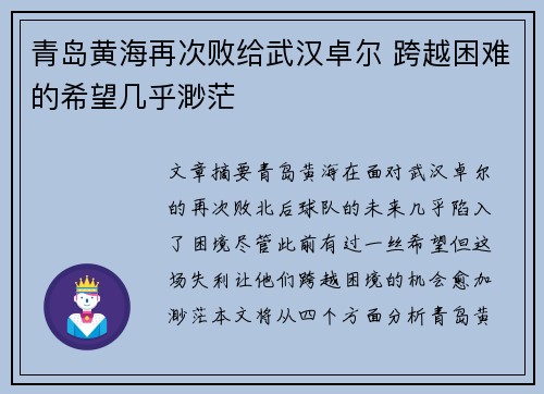 文章摘要:青岛黄海在面对武汉卓尔的再次败...