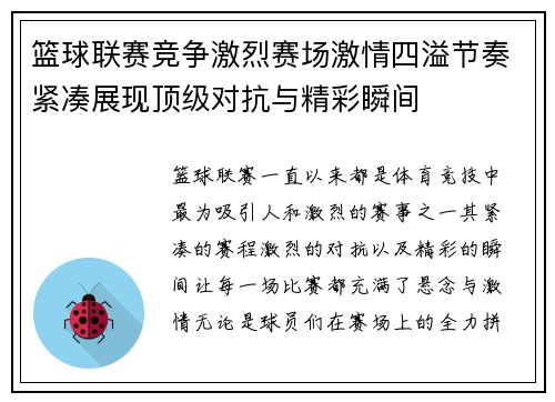 篮球联赛一直以来都是体育竞技中最为吸引人...