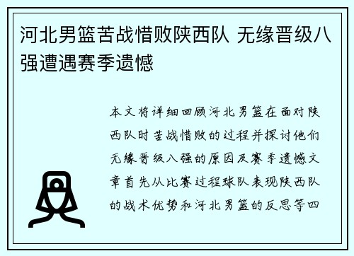 本文将详细回顾河北男篮在面对陕西队时苦战...