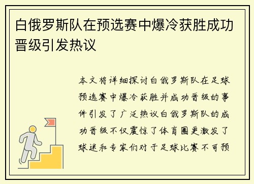 本文将详细探讨白俄罗斯队在足球预选赛中爆...
