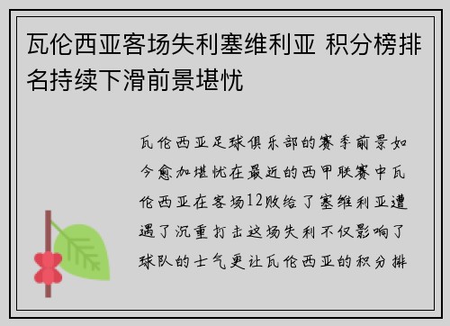 瓦伦西亚足球俱乐部的赛季前景如今愈加堪忧...