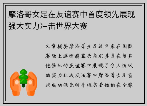 文章摘要:摩洛哥女足近年来在国际赛场上逐...