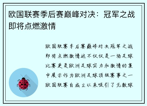 欧国联赛季后赛巅峰对决:冠军之战即将点燃...