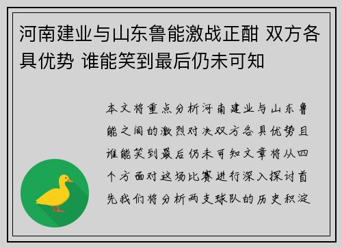 本文将重点分析河南建业与山东鲁能之间的激...