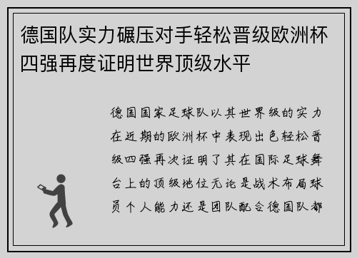 德国国家足球队以其世界级的实力在近期的欧...